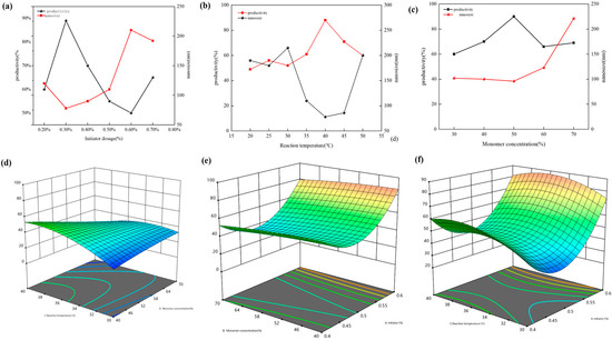 Effect of various factors on PAE yield and particle size Optimisation of synthesis conditions: (a,d) initiator dosage; (b,e) monomer concentration; (c,f) starting temperature.