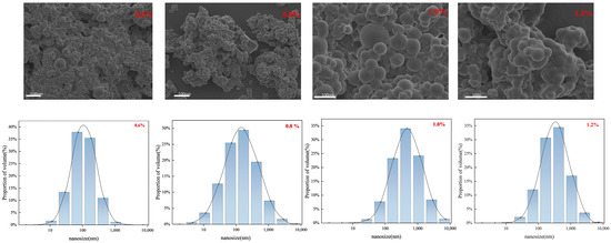 As shown in Figure 2, the particle size of the microspheres can be estimated from the particle size diagrams of 0.6% (75.45 nm), 0.8% (85.22 nm), 1.0% (110.30 nm), and 1.2% (150.34 nm) increases with the increasing crosslinking ratio, and we conclude that this is due to the amount of crosslinking agent added, the formation of moderately branched long polymer chains within the microspheres, and the dispersion of the amide group in the medium. Due to swelling, the amide group is hydrolyzed to carboxyl groups and electrostatic repulsion occurs between the adjacent carboxyl groups, stretching the long chains of the microsphere polymer and producing larger particle size microspheres. It can also be seen from the SEM that the crosslinking ratio is low, the microsphere has fewer internal crosslinking points, the formation of the three-dimensional network structure of the microsphere is incomplete, and the crosslinking agent content of the microsphere in the dry powder plays a crucial role in controlling the microparticle–spherical particle size. As the cross-linking ratio increases, the particle size of the microspheres gradually increases; as the cross-linking ratio continues to increase, ‘soft spheres’ with a complete network structure are formed.