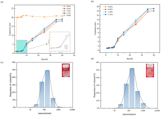 Slow-expansion performance of microspheres (a) for comparison with single-mesh microspheres; (b) for the slow-expansion time of microspheres with different crosslinker additives; (c) initial nanoscale microsphere size; (d) slow expansion at 80 °C for 48 h.