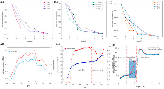 (a) For different concentrations; (b) for different mineralizations; (c) for the interfacial tension of the microspheres at different temperatures; (d) for the injection pressure and the resistance coefficients of the microspheres; (e) for PAM vs. PAE microsphere pressure; (f) for the microsphere drive modulation performance.