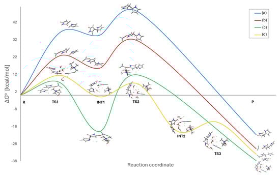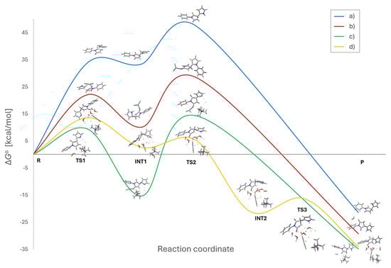 Relative Gibbs free energy values for the species involved in the reaction mechanisms a–d. All the ΔG0 values are in kcal/mol and were obtained at T = 298.15 K and P = 1 atm. is the sum of the Gibbs free energies of the reagents.