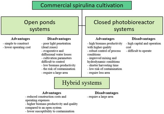 Comparison of spirulina production in open, closed, and hybrid systems [,].