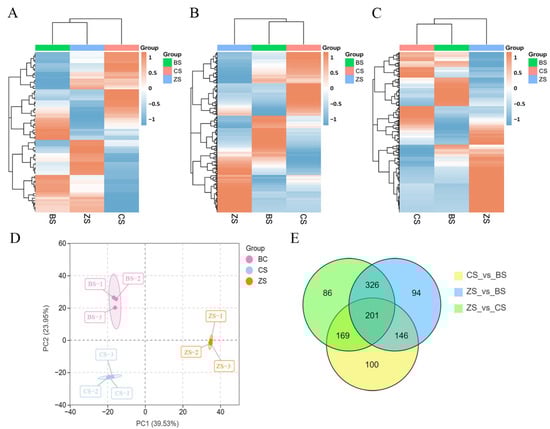 Additionally, we conducted differential metabolite screening for all the annotated three types of metabolites based on FC, p-value, and VIP scores. The results were visually presented as volcano plots, with the criteria were set as FC ≥ 2 or ≤ 0.5, p < 0.05, and VIP ≥ 1. To summarize, there are 423 significantly different metabolites between CS and BS (246 upregulated, 177 downregulated) (Figure 2D). Among them, there are 217 amino acids and their derivatives (121 upregulated, 96 downregulated), 180 organic acids (113 upregulated, 67 downregulated), and 26 lipids (12 upregulated, 14 downregulated). Between ZS and BS, there are 571 metabolites (323 upregulated, 248 downregulated) (Figure 2E). Among them, there are 276 amino acids and their derivatives (125 upregulated, 151 downregulated), 280 organic acids (191 upregulated, 89 downregulated), and 15 lipids (7 upregulated, 8 downregulated). Between ZS and CS, there are 616 metabolites (333 upregulated, 283 downregulated) (Figure 2F). Among them, there are 292 amino acids and their derivatives (120 upregulated, 172 downregulated), 303 organic acids (202 upregulated, 101 downregulated), and 21 lipids (11 upregulated, 10 downregulated). The comparison between CS and ZS showed the highest number of differential metabolites.