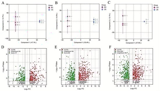 Differential metabolite analysis of the three sweet potato species. The score plots for (A) BS vs. CS, (B) BS vs. ZS, and (C) CS vs. ZS were derived using orthogonal partial least squares discriminant analysis (OPLS-DA). The volcano plots for (D) BS vs. CS, (E) BS vs. ZS, and (F) CS vs. ZS showed different levels of metabolites.