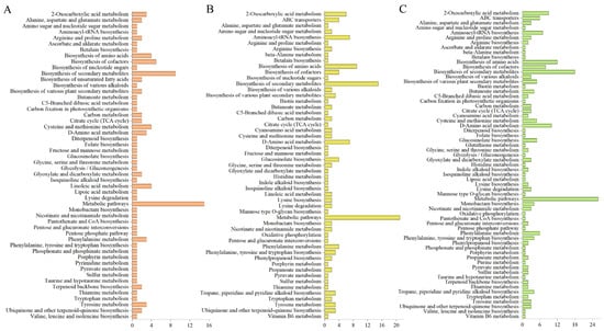 KEGG annotations. (A) Differential accumulation enrichment results of the three metabolites for CS vs. BS, (B) ZS vs. BS, and (C) ZS vs. CS. Horizontal coordinates represent the number of differential metabolites enriched in a pathway (orange represents the number of differential metabolites between CS vs. BS, yellow represents the number of differential metabolites between ZS vs. BS, and green represents the number of differential metabolites between ZS vs. CS); vertical coordinates represent the KEGG pathway names. The horizontal coordinates indicate the number of metabolites annotated in each pathway.