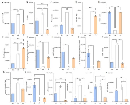 Peak area plots of several amino acids, organic acids, and lipids. (A–F): peak area values for several common organic acids; (G–L): peak area values for several common lipids; (M–P): peak area values of four human essential amino acids. * represents p ≤ 0.05; ** represents p ≤ 0.01; *** represents p ≤ 0.001. Blue represents BS, white represents CS, and orange represents ZS.