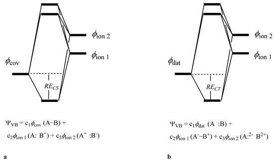 The resonance energy is then the difference between the covalent structure and the calculation including all three VB structures for that bond, as in Figure 5a. Bonds where the resonance energy is the main contributing factor are known as charge-shift bonds [22], and therefore this resonance energy is referred to as RECS herein. In the case of a dative bond, the difference between the dative structure alone and all three VB structures gives a measure of the charge transfer contribution and is designated RECT. We define RECT for the full π system, π2, as the difference between the 2-structure VB calculation with the dative electrons in the x and y positions and the full 8-π structure VB calculation.