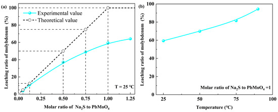 The effect of the molar ratio of Na2S to PbMoO4 and temperature on the dissolution/leaching behavior of wulfenite was investigated. As shown in Figure 1a, with the increase in the molar ratio of Na2S to PbMoO4, as shown, the molybdenum leaching ratio increased from 3.91% to 64.15%. According to the previous study [21], the reaction of wulfenite with an aqueous sodium sulfide could be written as Reaction (1). The aforementioned reaction equation demonstrates that the theoretical leaching ratio is equal to the molar ratio of Na2S to PbMoO4, provided that the molar ratio of Na2S to PbMoO4 falls within the range of 0 to 1. However, the experimental leaching ratio was lower than the theoretical value; furthermore, the gap widened as the molar ratio of Na2S to PbMoO4 approached 1. The effect of the leaching temperature is presented in Figure 1b. As the leaching temperature increased from 25 °C to 90 °C, the leaching ratio increased from 59.44% to 94.43%, indicating that high temperature is conducive to the leaching of molybdenum.