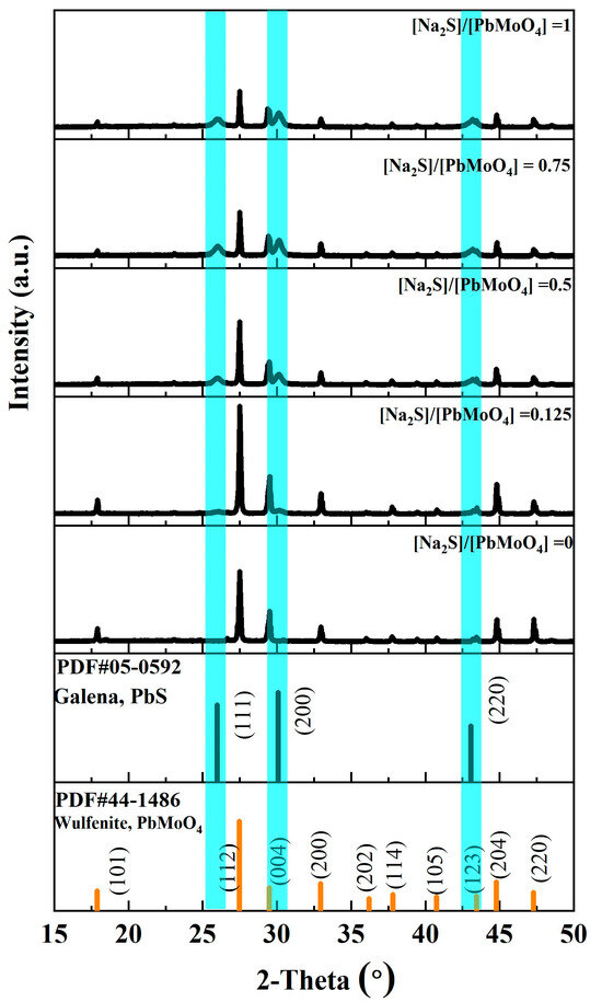 XRD patterns of wulfenite samples treated with different molar ratios of Na2S to PbMoO4.
