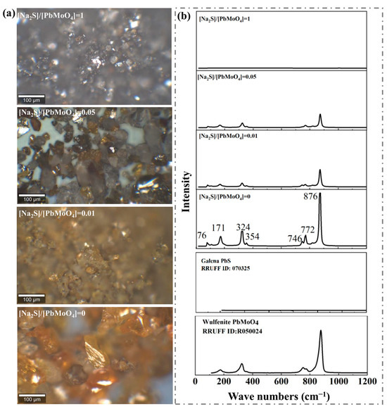 Optical micrographs (a) and corresponding Raman spectra (b) of wulfenite samples treated with different molar ratios of Na2S to PbMoO4.