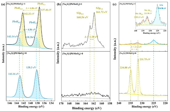 The XPS Pb 4f line is composed of spin–orbit doublets 4f7/2 and 4f5/2 with a peak area ratio of 4:3 and an energy separation of 4.86 eV. For the raw wulfenite surface, as shown in Figure 4a, a compliant Pb 4f7/2-4f5/2 spin–orbit doublet appeared at 143.16 eV and 138.30 eV, which resulted from PbMoO4 [24]. After sulfidization, the intensities of the doublets from Pb in PbMoO4 weakened; in addition, new Pb 4f5/2 and 4f7/2 doublets emerged at 142.32 eV and 137.46 eV, respectively, which can be well attributed to PbS [25].