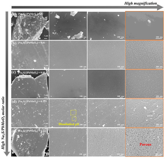 FESEM images at different magnifications of wulfenite particles sulfidized with different molar ratios of Na2S to PbMoO4.