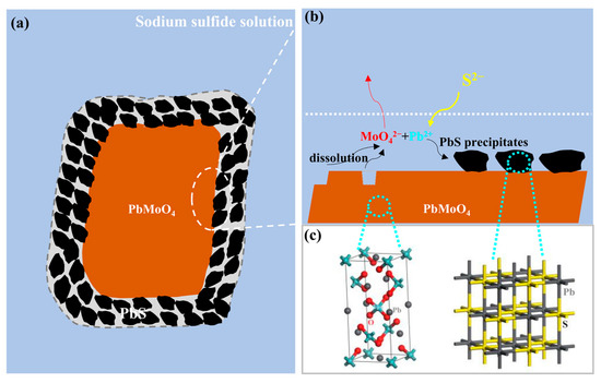 Based on the findings of this study, a schematic diagram of the sulfidized wulfenite particles with a PbMoO4/PbS core–shell structure is depicted in Figure 6a. Furthermore, the occurrence of wulfenite sulfidization via the ICDP mechanism is visually displayed in Figure 6b, and the microstructure changes before and after sulfidization can be seen in Figure 6c.