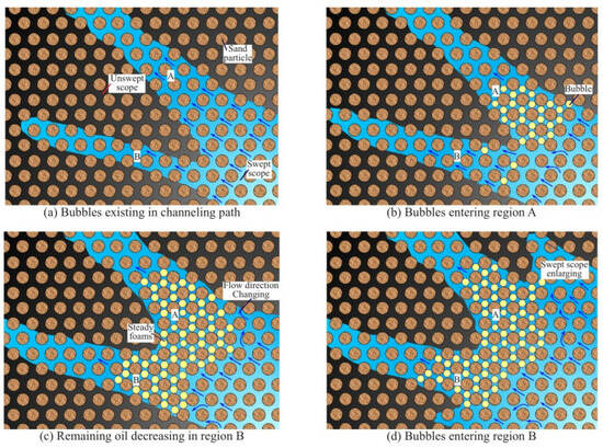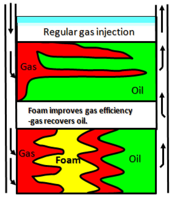 Owing to its characteristics of “plugging large holes instead of small ones and plugging water instead of oil,” foam flooding can effectively control gas flow and improve displacement efficiency [7] (Figure 2). It can also improve formation heterogeneity and inhibit gas channeling efficiently. Therefore, greater attention has been given to CO2 foam flooding technology, which has many advantages in flow control [7,8,9,10,11,12,13,14,15,16,17,18,19]. CO2 foam flooding functions by forming a multiphase dispersion system in which a surfactant aids the liquid film in dispersing CO2 in the liquid phase. Therefore, foam can effectively improve displacement front fingering and gas channeling by reducing the mobility ratio of CO2 and crude oil [8,9]. Recent studies have made significant strides in CO2-soluble surfactant technology, particularly focusing on surfactants that enhance foam stability and oil displacement in harsh reservoir conditions. For example, Li et al. [10] explored new amphiphilic surfactants that exhibited superior stability under high temperature and salinity conditions, extending foam half-life by over 30% compared to traditional surfactants. Similarly, recent work by Liang et al. [11] demonstrated that adding certain alcohol agents significantly enhances surfactant solubility in supercritical CO2, improving injectability in low-permeability reservoirs. These advancements highlight the growing importance of optimizing CO2-soluble surfactants for enhanced oil recovery in unconventional reservoirs. Hosseini’s work on the utilization of CO2 with polyelectrolyte complex nanoparticles and surfactants offers significant insights into environmentally friendly oil recovery methods, which is crucial for modern enhanced oil recovery (EOR) practices [12].