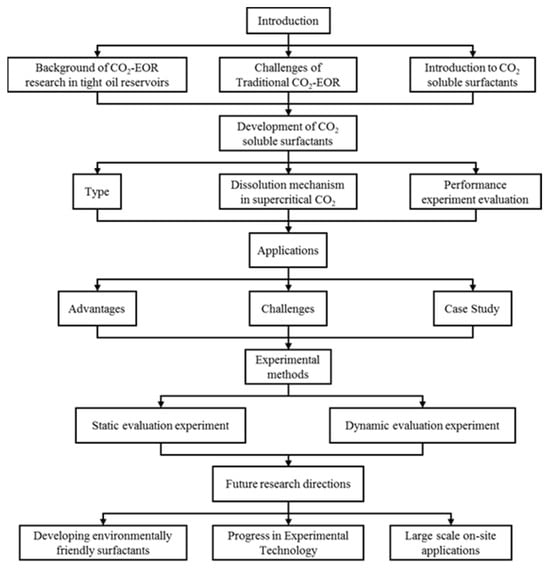 To provide a clear overview of the scope of this article, a flow chart summarizing the main research areas and findings is presented below (Figure 3). This chart outlines the key components of the study, including the development of CO2-soluble surfactants, their evaluation through experimental methods, their application in tight oil reservoirs, and potential future research directions.