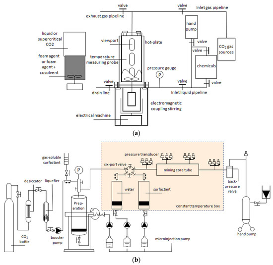 The laboratory study of CO2 foam mainly includes static and dynamic experiments. Static experiments are always used to investigate the foaming ability and foam stability of surfactants. The surfactant’s foaming ability was analyzed based on the observed foam volume and half-life. Figure 4a [37] shows the static experimental system, which includes a CO2 gas source, foam solution tank, and PVT reactor. Through the reactor’s viewing window, the foam volume and foam half-life can be observed to evaluate the surfactant’s foaming ability and foam’s stability. Figure 4b [33] depicts the dynamic experimental system, which mainly includes the sand-filling model, injection, data reading, production, and auxiliary systems. The injection system mainly comprises a CO2 gas cylinder, dryer, liquefier, booster pump, sampler, and intermediate container.