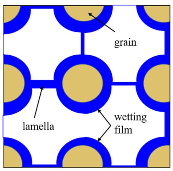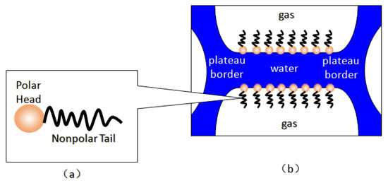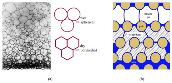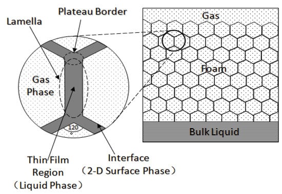 Foam is usually defined as a dispersion of gas in a continuous liquid phase [51,59,60,61]. A “lamella” separates the gas phase and makes it discontinuous in a liquid film. The lamellae are thin liquid films with interfaces on both sides of the liquid phase (Figure 6) [62]. In other words, they are thin, free aqueous retention layers surrounded by gas on both sides. The liquid phase usually contains surfactants, which stabilize the lamella via surfactant adsorption at the gas–liquid interface [60]. Surfactant molecules are generally adsorbed on both sides of the liquid film to stabilize the film. The liquid film thickness is only a few microns or even only a few nanometers. When the film is connected to other lamellae, the area can be expanded to a few square meters [63]. The liquid phase may also contain macromolecules or solid particles as alternatives to surfactants. As shown in Figure 7 [61], the bottom of the bulk foam structure is the liquid phase, and the top is the gas phase. The gas phase separates from the lamellar liquid phase through a two-dimensional interface at the microscopic level.