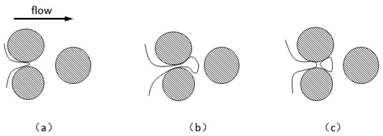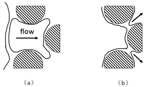 Foam formation in porous media can be defined as the formation of a new foam lamella. Foam formation is a complex process, and its formation mechanism has basically reached a consensus, which can be divided into three cases: snap-off, lamellar division, and leave-behind [88]. The first two cases produce strong foams, and the latter produces weak foams. These three mechanisms are the basis for understanding foam behavior in porous media, so they are introduced separately.