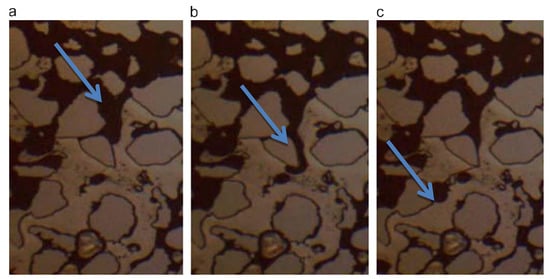 When Radke et al. [89] first proposed the snap-off mechanism, they believed that snap-off was the most important mechanism for direct visual observation of foam formation. Kovscek et al. [90] developed a fluid dynamics theory to describe the horizontal aggregation of liquid in narrow and angular pores under the action of a pressure gradient. They developed a statistical network model to describe the average rate of foam formation by detachment in porous media. As shown in Figure 9 [90], the foam will snap off when the foam curvature difference between the front part of the foam and the contraction part is enough to cause the liquid flow to shrink back. Foam detachment can be divided into the following three cases: (1) When the upstream pressure exceeds the capillary pressure, the gas phase begins to invade the pore throat. The foam front enters the downstream pore, and the liquid phase rushes into the throat due to the capillary pressure gradient, after which the curvature of the foam front decreases with expansion. The rapidly flowing liquid phase forms a liquid ring until the foam snaps off. (2) When foams block the throat, the ensuing liquid pressure gradient drives the accumulated liquid upstream of the throat to clamp smaller foams. (3) The foam separates when the foam breaks away from a long, straight channel. These three cases may occur in the absence of a surfactant. The static condition for snap-off is that the ratio of the pore throat to the channel is approximately 1:3, depending on the specific shape of the channel cross-section. This ensures that when the interface moves from the pore throat to the channel, the capillary pressure at the front of the interface is less than the capillary pressure at the throat [62]. Some studies have shown that crude oil can affect foam snap-off. The snapped-off oil in the pores downstream of the pore throat will hinder or prevent the snapping-off of foams. This hindrance may be the result of insufficient surfactant concentration in the foam to prevent film rupture or an unstable oil phase surface of the pseudo-emulsified film.
