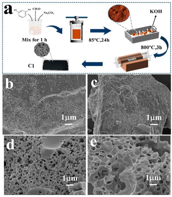 The synthesis process of carbon aerogel materials (a) and the SEM images of synthesized carbon aerogels materials with various KOH/RF ratios: (b) C0, (c) C0.5, (d) C1, and (e) C2.
