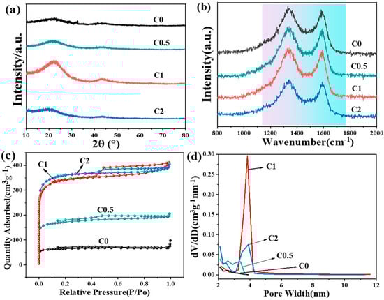 The specific surface area and pore size distribution of all samples were analyzed using nitrogen adsorption–desorption isotherms, as shown in Figure 2c,d and summarized in Table 1. All samples, except for C0, exhibited high uptakes at P/P0 < 0.05, indicating the presence of substantial micropores. The hysteresis loops observed in samples C0.5, C1, and C2, characterized by a typical H3 type over a wide pressure range of P/P0 = 0.4–1.0, reveal the formation of mesopores resulting from alkali activation. Notably, the mesopore size distributions for samples C1 and C2 are centered at ~4 nm, as illustrated in Figure 2d.