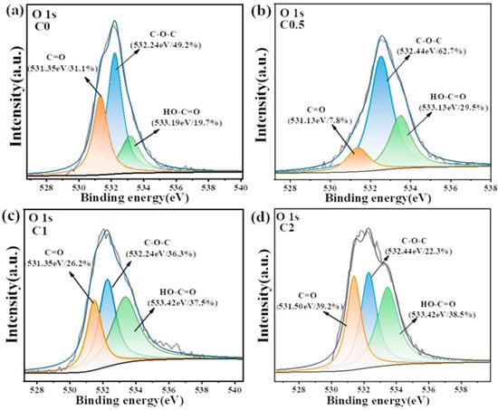 Supplementary Figure S1 shows the XPS spectra of C0, C0.5, C1, and C2, indicating that all samples contain elements C and O, with corresponding peaks primarily represented by O 1s and C 1s peaks, respectively. The O 1S XPS spectra (Figure 3) of these four samples showed three obvious peaks at 531.13, 532.45, and 533.42 eV, which are attributed to C=O, C-O-C, and HO-C=O bonds, respectively [,].