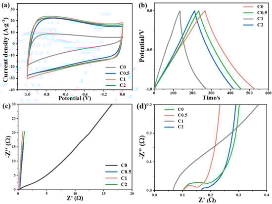 Electrochemical impedance spectroscopy (EIS) was performed to further evaluate the electrochemical performance of the four materials (Figure 4c,d). The steep slope in the low-frequency region demonstrates their capacitive performance with low Warburg resistance (Zw), and the semicircle in the high-frequency region demonstrates their charge-transfer resistance (Rct) []. C0 exhibited higher Warburg resistance (Zw), and C0.5 displayed higher internal resistance (RΩ). Conversely, C1 and C2 possessed more favorable resistance values than other samples, implying that their porous structure was beneficial for the charge-transition efficiency.