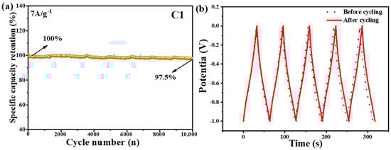 (a) The long cycling performance test of C1 at 7A·g−1 (b) and a comparison GCD test diagram of C1 sample before and after 10,000 cycles.