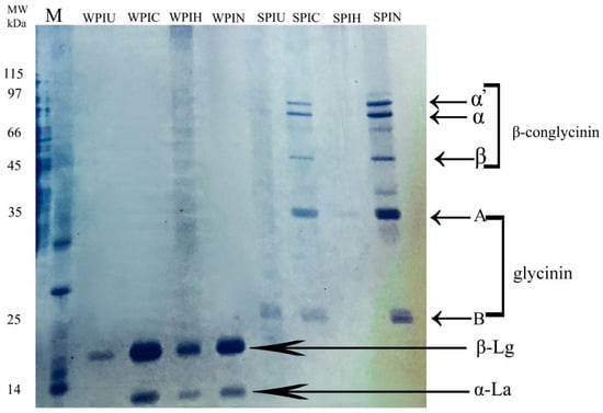 Sodium dodecyl sulfate-polyacrylamide gel electrophoresis (SDS-PAGE) is one of the most popular and important techniques for separating protein fractions based on molecular weight [22,23]. As can be observed in Figure 1, SPI 11s (glycine) consisted of two subunits: acidic (A) and alkaline (B), characterized by bands at ~34 kDa and ~20 kDa, respectively. Also, the 7S globulin (β-glycine), including the α, ά, and β subunits, was visible at bands of ~70–80 kDa and 58 kDa, respectively. In the WPI pattern, α-lactalbumin (α-La) appeared at ~14 kDa, and β-lactoglobulin (β-Lg) was observed at ~18 kDa. The obtained results from SDS-PAGE analysis of SPI and WPI were similar to previous reports on their molecular weights [24,25]. The bands for native SPI were observed between 20 and 80 kDa. However, both ultrasonication and heating treatments led to the denaturation of SPI, as evidenced by the SPIU and SPIH electrophoretic patterns.