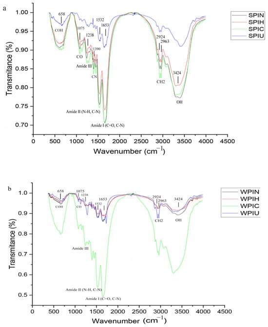 Figure 2. Fourier transform infrared spectroscopy spectra of SPIN (natural soy protein isolate), SPIH (heat-treated soybean protein isolate), SPIC (soybean protein isolate treated with cold plasma), and SPIU (ultrasonic-treated soybean protein isolate) (a). Infrared conversion spectroscopy of Fourier transform of WPIN (natural whey protein isolate), WPIH (heat-treated whey protein isolate), WPIC (cold plasma-treated whey protein isolate), and WPIU (ultrasonic-treated whey protein isolate) (b).