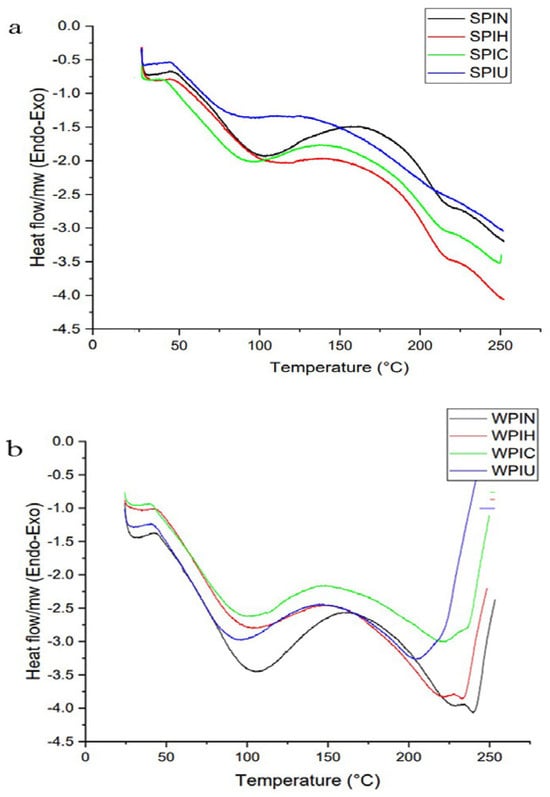 The thermal properties of both raw and treated SPIs and WPIs were investigated using a DSC (DSC 250, TA Instruments, Newcastle, DE, USA). The proteins were scanned over a temperature range of 25 to 250 °C at a rate of 5 °C per minute. Approximately 5 mg of each powder was placed in hermetically sealed aluminum pans under an inert atmosphere with an empty pan used as a reference [9,34]. The data were analyzed using TA Universal Analysis software 4.5 A.