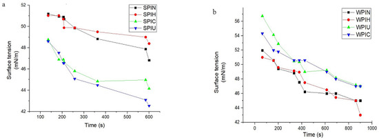 The surface tension of protein systems heavily relies on the combination and concentration of surface-active agents present. The rate of diffusion of surfactants towards the surface determines the composition of the monomolecular layer at the interface. Additionally, surfactants adsorbed at the interface can lead to protein unfolding and denaturing. Replacement of original surfactants with more surface-active agents can also occur [7]. Figure 4a,b show the changes in surface tension of SPI and WPI at the air–water interface over time. The observation conditions remained constant in all treatments for 600 and 800 s. The surface tension of both SPIN and SPIH started at 51 mN/m and gradually decreased to 50 mN/m after 250 s. After approximately 350 s, SPIN reached a surface tension of 49 mN/m, decreasing faster than SPIH. The surface tension of both SPIN and SPIH steadily decreased over 550 s and reached 47 ± 0.8 and 48 ± 0.8 mN/m, respectively, at the 600 s mark. The surface activity of SPIC and SPIU was higher than that of SPIN and SPIN, which indicated their better performance as emulsifiers. The presence of a hydrophobic group played an important role in the adsorption ability of SPIU and SPIC, confirming previous results that reported that the minimal surface activity of SPI was about 50 mN/m. Various treatments have been applied, causing surface tension changes due to functional groups [6].