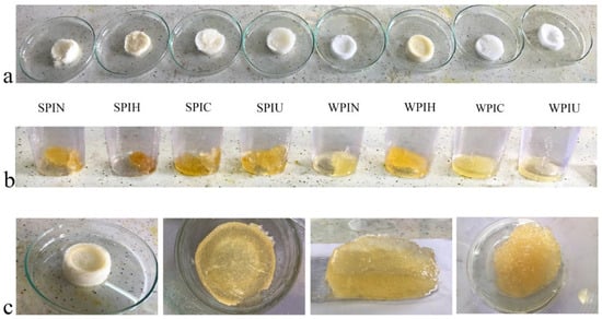 Figure 5. Cryogel and oleogel images resulting from various protein treatments. (a) Cryogels produced from natural and treated protein by foam method. (b) Final oleogel produced from cryogel. (c) Production steps of oleogel from cryogel include oil absorption and homogenization. SPIN: natural soy protein isolate. SPIH: heat-treated soy protein isolate. SPIC: atmospheric cold plasma-treated soy protein isolate. SPIU: ultrasonic-treated soy protein isolate. WPIN: natural whey protein isolate. WPIH: heat-treated whey protein isolate. WPIC: atmospheric cold plasma-treated whey protein isolate. WPIU: ultrasonic-treated whey protein isolate.