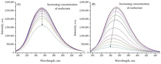 Fluorescence spectroscopy is a well-recognized method for assessing changes in the microenvironment in the vicinity of the chromophore. Thus, there are two tryptophan residues (Trp 134 and Trp 213) in the BSA structure, located in domain IB and in a hydrophobic pocket in domain IIA [33]. In Figure 1 (all emission spectra of BSA in the presence of 14a–d and 15a–d are presented in Supplementary Materials), the fluorescence spectra of BSA with surfactants are presented.
