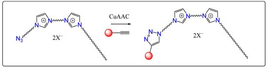 Therefore, the synthetic strategy was modified. Instead of alkylimidazoles 10a–c, the previously obtained azide imidazole derivatives 4 and 9 were introduced into the quaternization reaction. The syntheses were carried out similarly to those in the procedure of compounds 11a–c (Scheme 5). In these cases, the formation of minor symmetrical bis-imidazolium derivatives also occurred. However, compounds 12–13 were successfully purified by SiO2 column chromatography (eluent: acetone/methanol = 10/1).