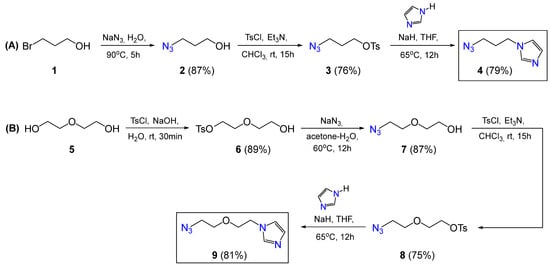 In the first stage of this work, azide containing imidazole derivatives was synthesized (compounds 4 and 9). Despite the fact that these compounds are known, the literature methods for their synthesis are inconvenient. Thus, to obtain imidazole 4, the authors of the work [21] used 3-(1H-imidazole)propan-1-amine, which was then reacted with explosive trifluoromethane or imidazole sulfonyl azides. To obtain compound 9, the authors of [22] carried out alkylation of imidazole with di(2-chloroethyl)ether to produce imidazole containing a terminal chloride group, which was then subjected to a substitution reaction with sodium azide. This method suffers from a bis-imidazole byproduct. To prepare compounds 4 and 9, we propose the alkylation of imidazole with tosylate derivatives 3 (Scheme 2A) and 8 (Scheme 2B) in the presence of sodium hydride. Thus, compounds 4 and 9 were obtained in 79% and 81% yields, respectively.