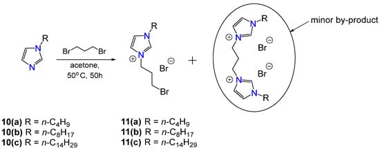 Thus, N-alkylimidazoles 10a–c reacted with a twelvefold excess of 1,3-dibromopropane (Scheme 3). Syntheses were carried out at high dilution in acetone at 50 °C. Using GCMS, it was found that complete conversion of the starting substrates was achieved within 50 h. Despite the large excess of 1,3-dibromopropane, the formation of symmetric bisimidazolium derivatives as impurities was found. Several standard methods were used to purify target compounds, and none of them proved effective.