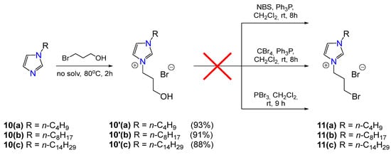 Next, an alternative method for obtaining compounds 11a–c was proposed. It consisted of the quaternization of N-alkylimidazoles 10a–c with a 3-bromopropanol-1 followed by the introduction of the obtained imidazolium salts 10′a–c to the bromination stage (Scheme 4). Compounds 10′a–c were obtained using the method described in [26] and were involved in a reaction with three standard bromination reagents: NBS/PPh3, CBr4/PPh3 and PBr3. However, none of them led us to obtain compounds 11a–c in pure form.