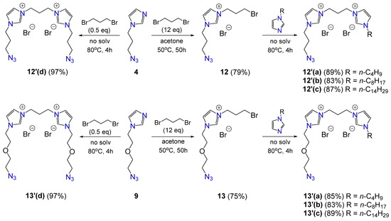 Next, compounds 12–13 were reacted with an equimolar amount of N-alkylimidazoles 10a–c (Scheme 5). Syntheses were carried out without solvent at a temperature of 80 °C. Four hours after the start of stirring, an increase in the viscosity of the reaction mixture was observed. Using GCMS, complete conversion of the starting N-alkylimidazoles was established. After isolation, a series of unsymmetrical bisimidazolium salts (compounds 12′a–c and 13′a–c) containing an alkyl moiety on one imidazolium head group and a propyl/oxyethyl azide moiety on the other were obtained in high yields. Also, symmetrical azide-containing bisimidazolium salts 12′d and 13′d were obtained in almost quantitative yields (Scheme 5). For this, 1 eq of 1,3-dibromopropane with 2 eq of imidazoles 4 or 9 was stirred at 80 °C.