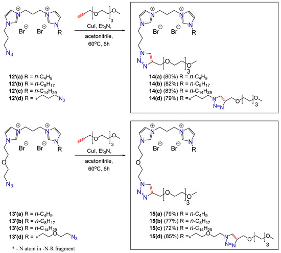 Finally, compounds 12′a–d and 13′a–d were introduced into the azide-alkyne cycloaddition reaction with triethylene glycol propargyl methyl ether (Scheme 6). The synthesis took place in acetonitrile with a СuI-NEt3 catalytic system. To purify target compounds from copper, aqueous solutions of compounds were passed through Amberlite IRA-67. After washing the aqueous solution with diethyl ether and water evaporation, a series of triazole-bis-imidazolium derivatives, 14a–d and 15a–d, were obtained in 72–85% yield.
