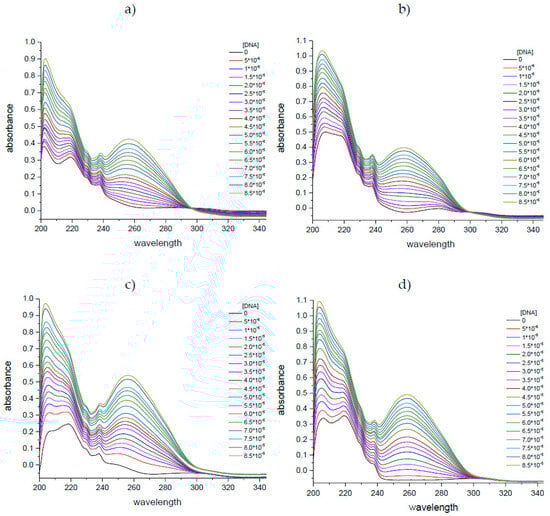 The absorption spectra in the absence and presence of various molar concentrations (M) of ctDNA added to phthalic acid imide derivative solutions (10 μM): (a) compound A, (b) compound B, (c) compound C, and (d) compound D.