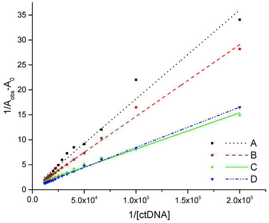 The UV data fitting line to the Benesi–Hildebrand equation. The absorption changes assumed by the addition of ctDNA to phthalic acid imide derivative solutions (10 μM): compound A (black, dotted line), compound B (red, dashed line), compound C (blue, dash-dotted line), and compound D (green, solid line).