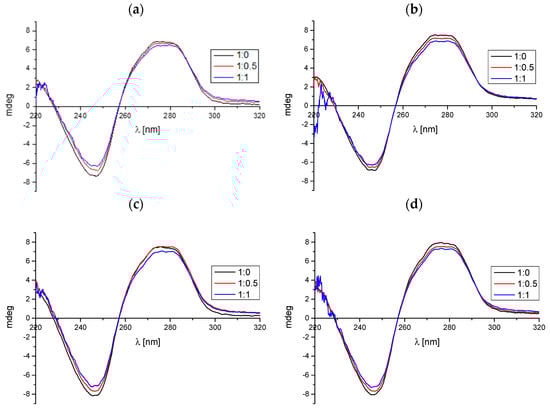 The CD spectra of ctDNA with increasing the concentration of the tested compounds: (a) compound A, (b) compound B, (c) compound C, and (d) compound D. The measurements were performed for the following molar ratios of ctDNA to phthalimide analog: 1:0, 1:0.5, and 1:1.