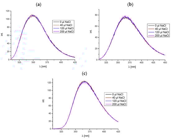 In order to investigate whether electrostatic interactions occur between the DNA molecule and phthalic acid imide derivatives, the fluorescence spectroscopy method was used. In this case, the changes occurring in the emission spectra of the tested compounds are analyzed during increasing ionic strength in the phthalimide derivative/ctDNA system. The increase in ionic strength was obtained by adding portions of 1 mM NaCl solution to the tested sample. The measurements were performed for compounds A, B, and C. It was not possible to perform this experiment for the D/ctDNA system, because this derivative does not show the fluorescence phenomenon, which was proven and described in the work [3]. The obtained spectra are shown in Figure 5.