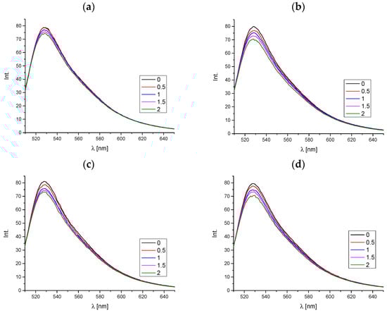 The emission spectra of ctDNA–acridine orange complex with an increase in the concentration of the tested compounds: (a) compound A, (b) compound B, (c) compound C, and (d) compound D. The measurements were performed for the following molar ratios of ctDNA to phthalimide analog: 1:0, 1:0.5, 1:1, 1:1.5, and 1:2.