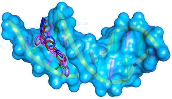 The docking studies were performed using AutoDock Tools 1.5.6 [38] and the AutoDockVina 1.1.2 script [39]. The 3D structures of the compounds were optimized using the Gaussian 2016 C.01 software package [40] with the B3LYP/6-31+G (d.p) basic set. The B-DNA-1vzk [30] structures were used. For the ligands, rotatable bonds were assigned, non-polar hydrogens were merged, and partial charges were added. For the crystal structure of DNA, co-crystallized molecules and water were removed. Kollman partial charges and non-polar hydrogens were added. The docking protocol was first validated by self-docking the co-crystallized ligand.