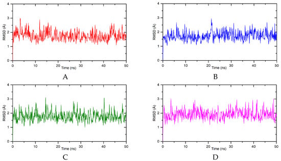 The RMSD plots of the DNA backbone atoms for systems with compounds A–D.