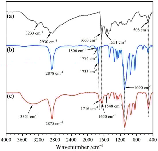 The chemical structures of ε–PL, 4–arm–PEG–Mal, and dry PEG/ε–PL gels (DLG–n) were characterized by FT-IR, and the spectra are displayed in Figure 2 (DLG–n samples have similar FT-IR spectra, and DLG–7 is taken as a representative sample). In the FT-IR spectrum of ε–PL (Figure 2a), the absorption peaks at 3233, 2930, 1663, 1551, 1250, and 508 cm−1 belonged to the stretching vibrations of N–H, C–H, amide I, amide II, C–N, and –NH–, respectively. In addition, a broad strong absorption was observed at 3000~2800 cm−1, which was attributed to the asymmetric and symmetric stretching vibrations of –NH3+ [37]. 4–arm–PEG–Mal (Figure 2b) exhibited the characteristic absorption of –CH2–, ester C=O, and ether C–O–C at 2870, 1735, and 1090 cm−1, respectively. The weak peaks at 1774 and 1806 cm−1 were ascribed to the characteristic absorption of the C=O and amide groups in the maleimide ring. The maleimide groups were linked only at the end of the PEG chain, and their low content resulted in reduced absorption intensity, proving the successful synthesis of 4–arm–PEG–Mal. In the FT–IR spectrum of DLG–7 (Figure 2c), the characteristic peaks of ε–PL and 4–arm–PEG–Mal were observed. The absorption peaks of –CH2–, ester C=O, amide I, amide II, ether C–O–C, and –NH– appeared at 2875, 1716, 1650, 1548, 1090, and 508 cm−1, respectively. The absorption intensity of –NH3+ (3000~2900 cm−1) showed a significant decrease, accompanied by a broader band of amide (508 cm−1), which confirmed that the chemical reactions of maleimide/–NH2 indeed occurred and the cross-linked structures were formed. It was worth noting that the absorption peaks for ester C=O and amide I exhibited a blue shift, due to the H–bonds formed between C=O and –NH–. A similar phenomenon was also observed in our reported poly(ether-urethane) elastomers based on phenol-urethane bonds [38]. Additionally, the broad peak at 3351 cm−1 corresponded to the absorption of residual moisture in the dry gel.