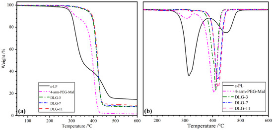(a) TGA and (b) DTG curves of ε–PL, 4–arm–PEG–Mal, and DLG–n.