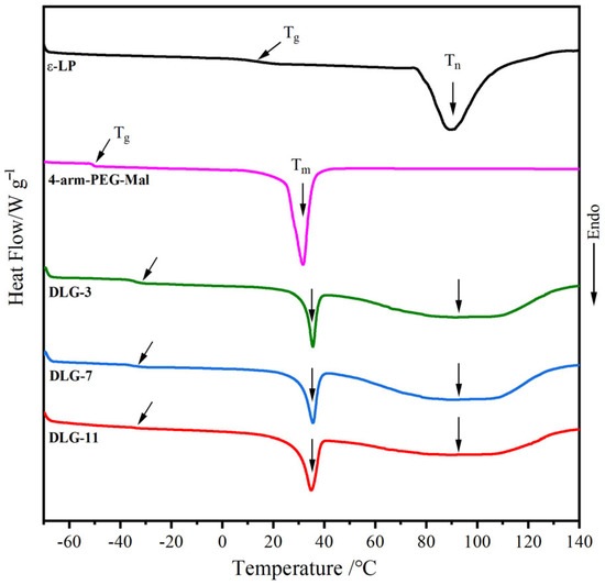 DSC curves of ε–PL, 4–arm–PEG–Mal, and DLG–n.